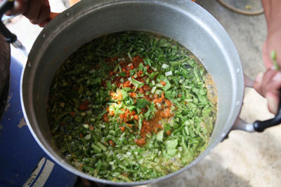 o Mixture of local vegetables such as morning glory (spinach family) and carrots that are boiled into a soup. Most leafy greens can be substituted.